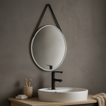 Its sleek metal frame, paired with a luxurious faux-leather black hanging strap, adds a refined touch that enhances any room’s aesthetic. Whether placed above a vanity in a dressing room, as a chic accent in a bathroom, or as a striking focal point in a hallway, this mirror transforms your space with effortless style.