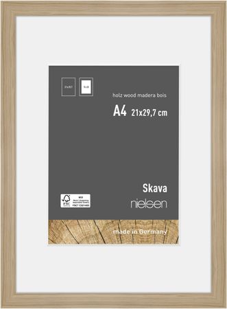 The Skava wooden frame by nielsen stands out with its elegant and minimalist frame design, offering a professional framing finish with a white mount included. Available in 3 colours, black, white and oak, and various sizes for photograph, print and poster framing.